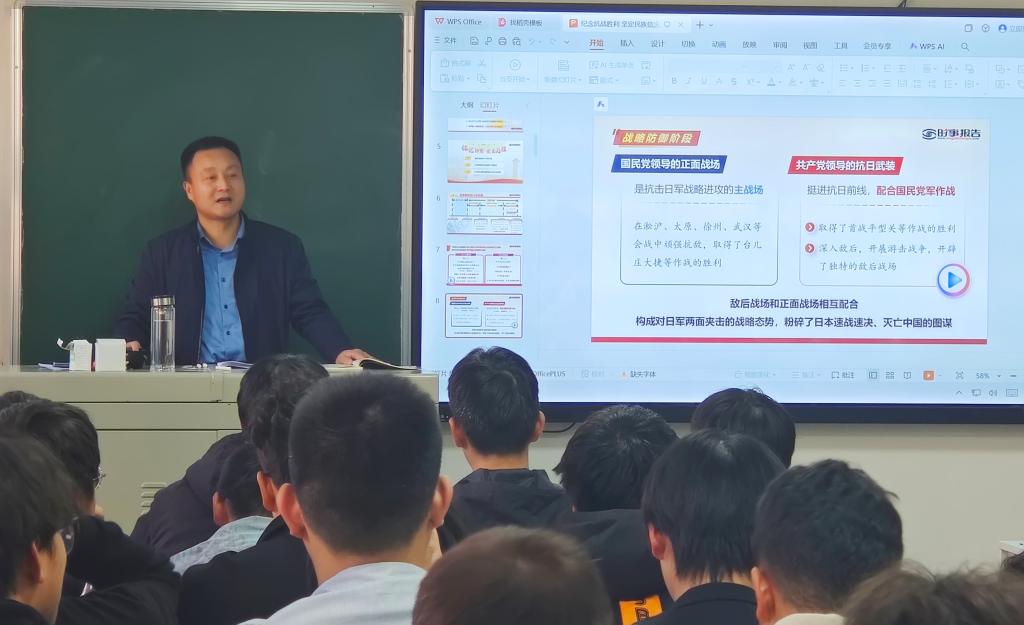 10月13日上午,太阳成集团tyc151cc经理贾小勇为25级数控技术1班、2班员工,带来了一堂主题鲜明、内涵深刻的形势与政策课,围绕《纪念抗战胜利 坚定民族信念》专题,带领员工重温抗战历史、感悟抗战精神、汲取奋进力量。